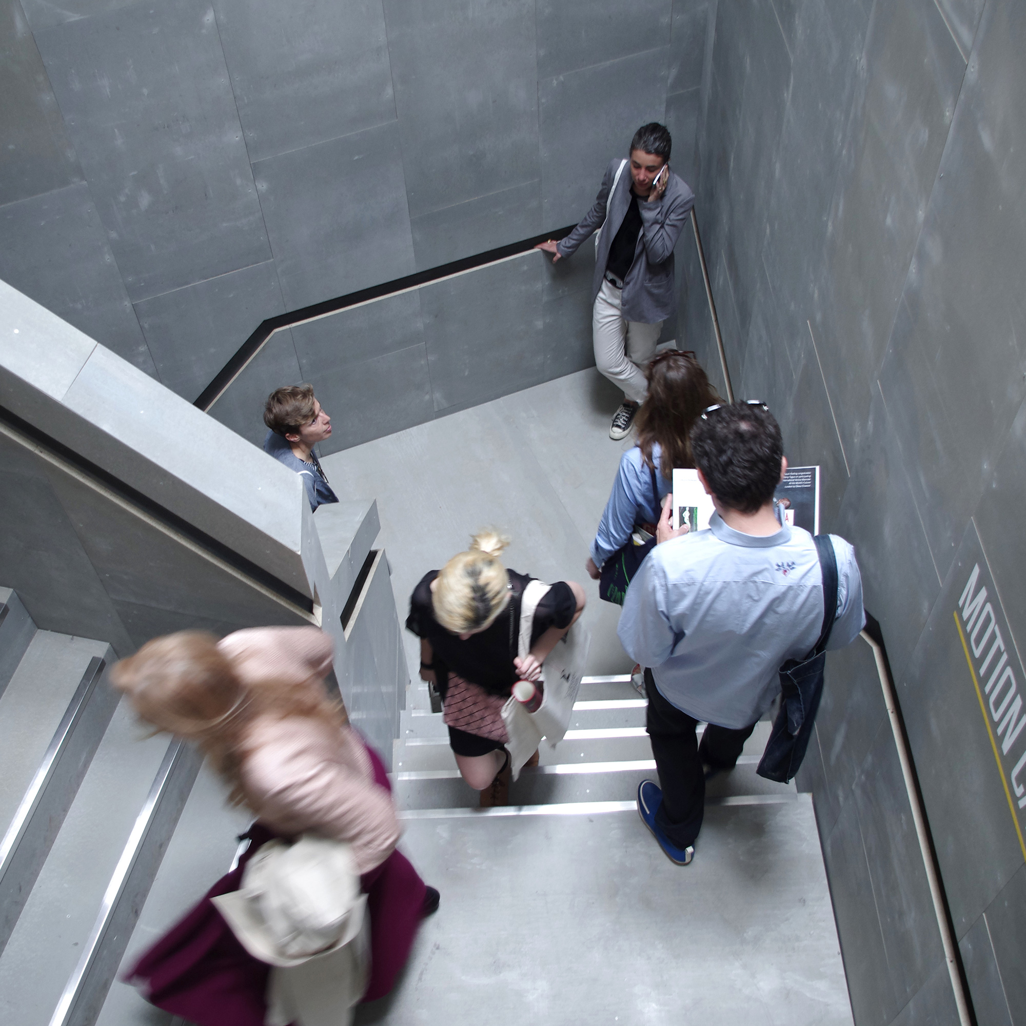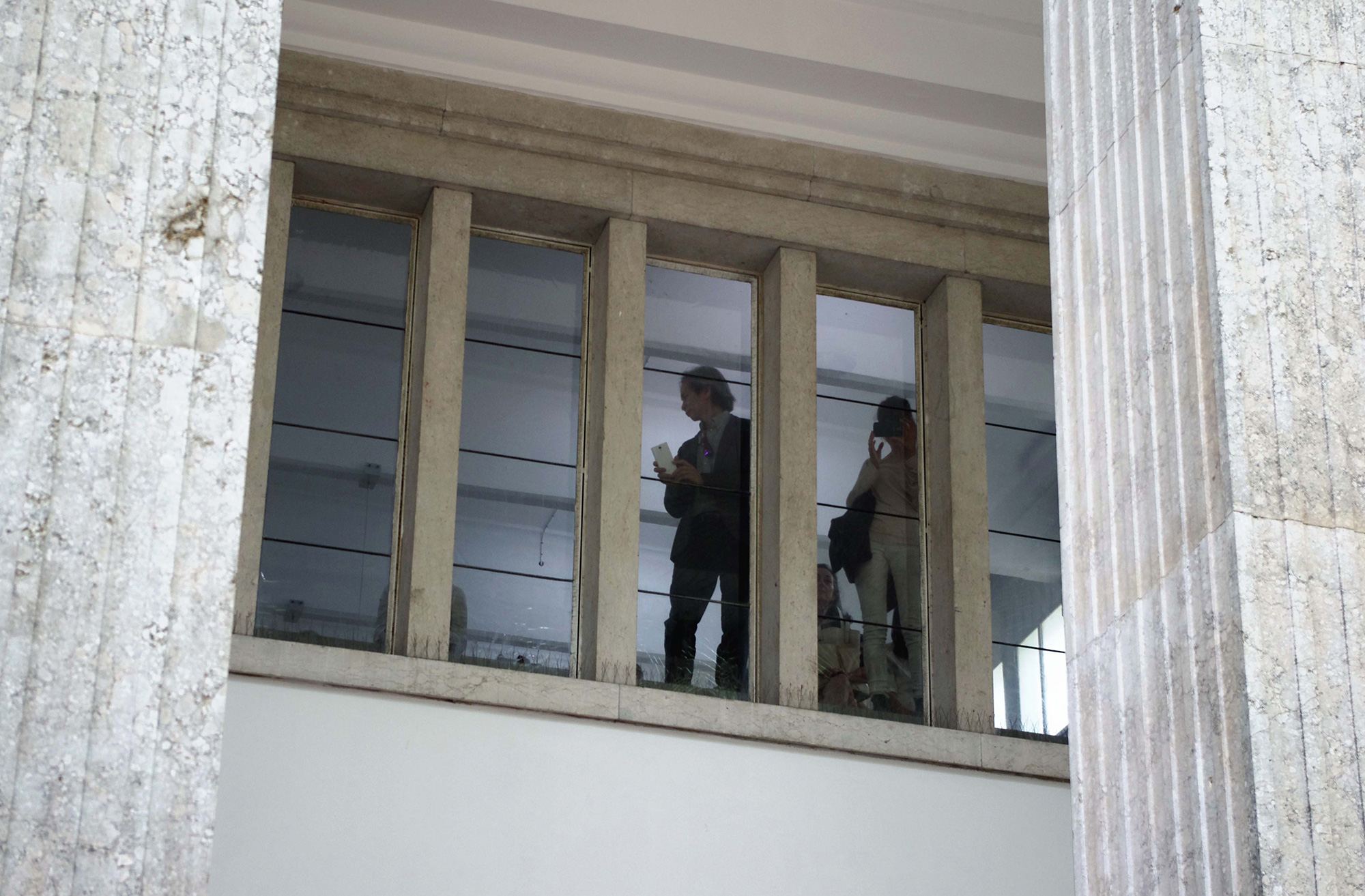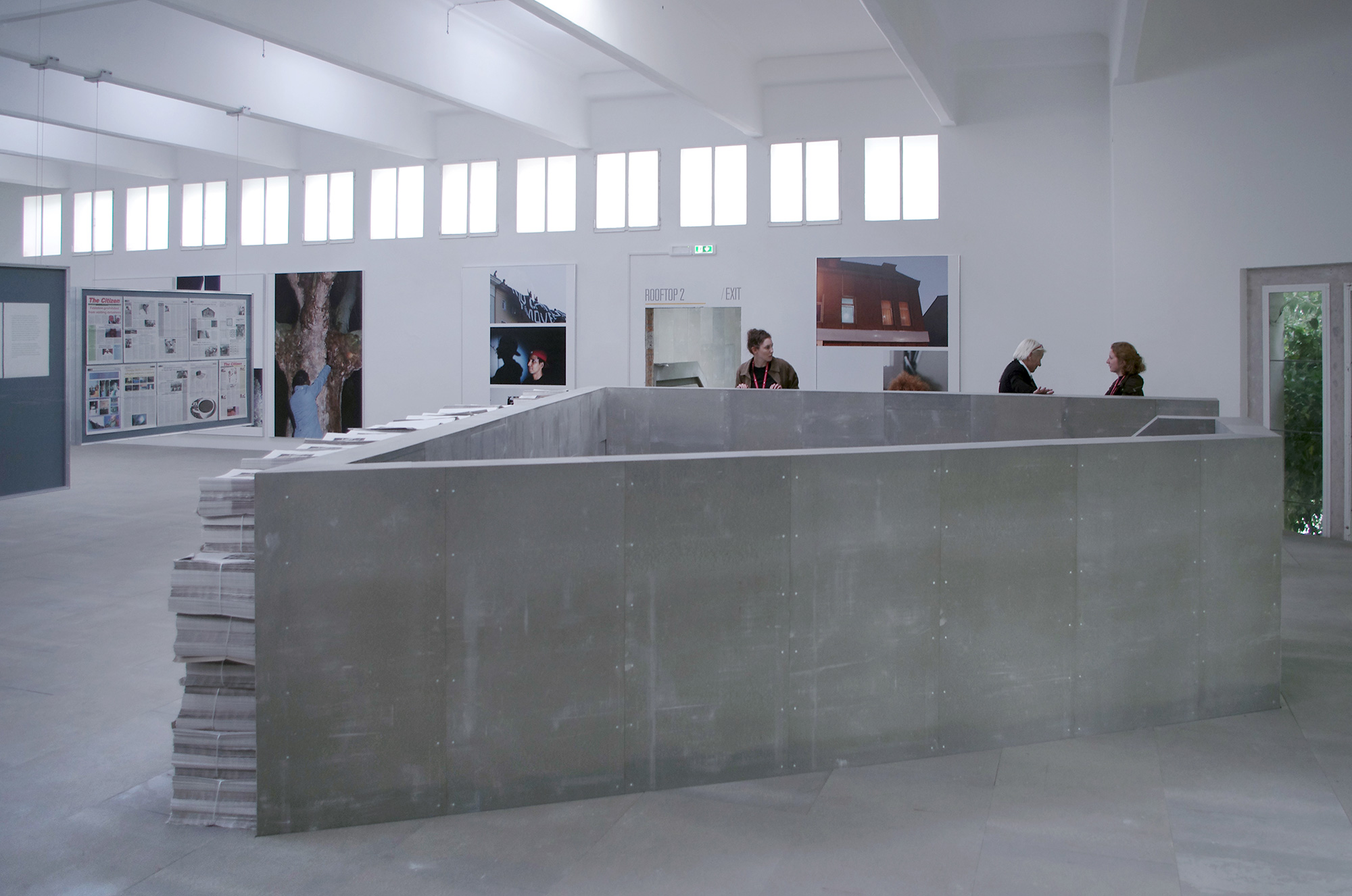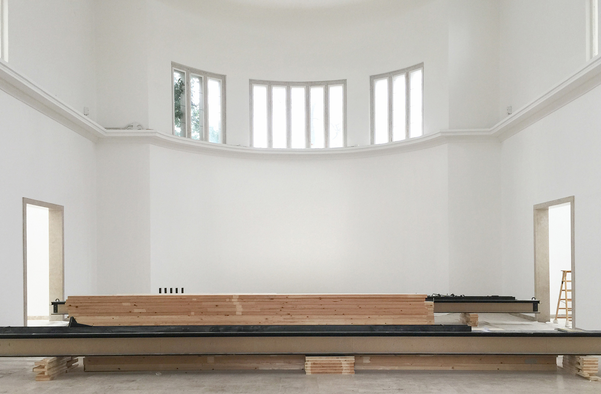 Unter Verwendung konstruktiver Bestandteile des „Kanzlerbungalows“ der vorhergehenden Architekturbiennale, erhielt der Pavillon eine zweite Ebene. Für die Erschließung dient eine bisher nicht genutzte Treppe im Portikus als neuer Zugang. Die interne Ver- bindung zwischen den Ausstellungsbereichen erfolgt vertikal durch drei Treppen, die nun hinunter in ein neues „Untergeschoss“ führen.
